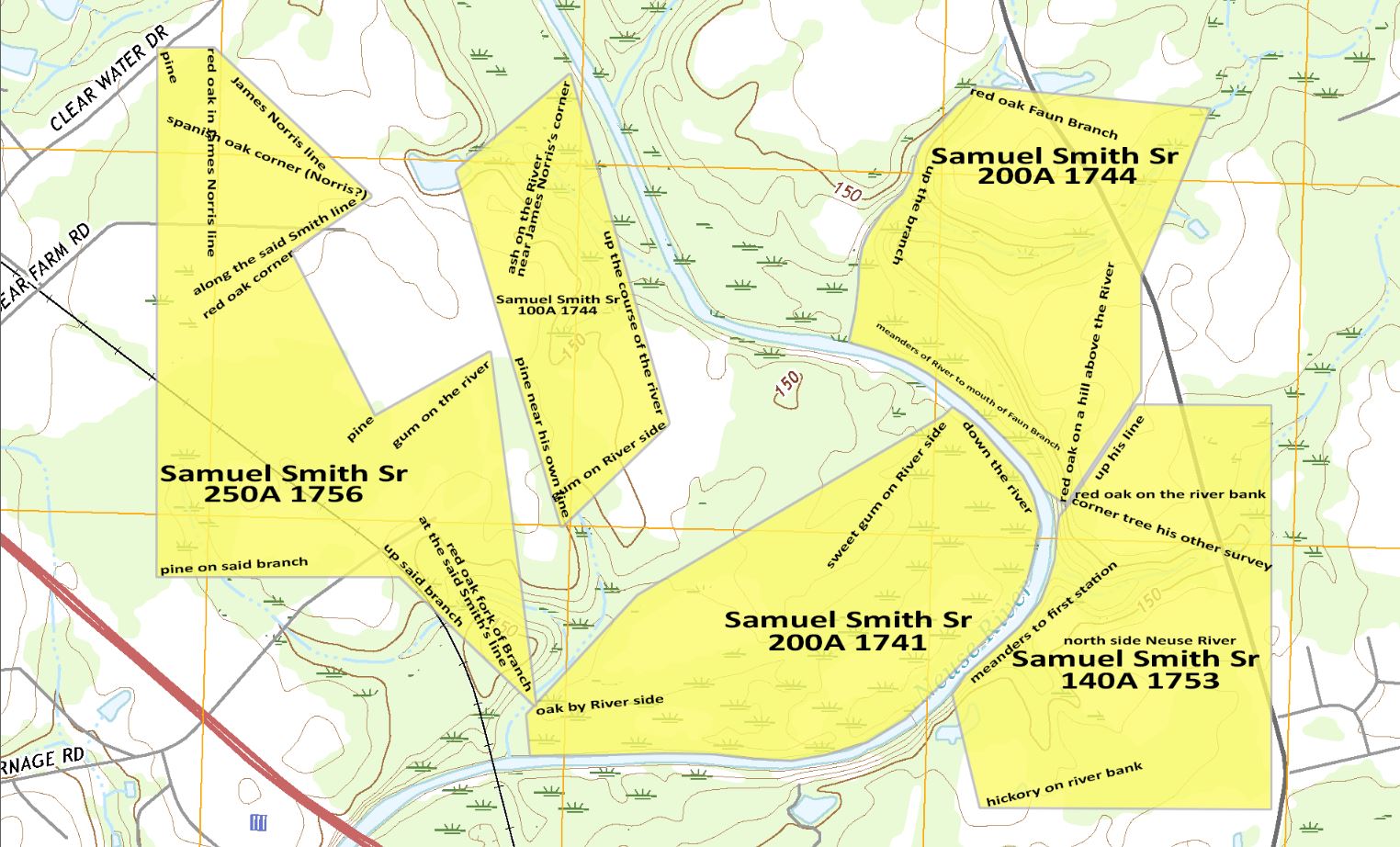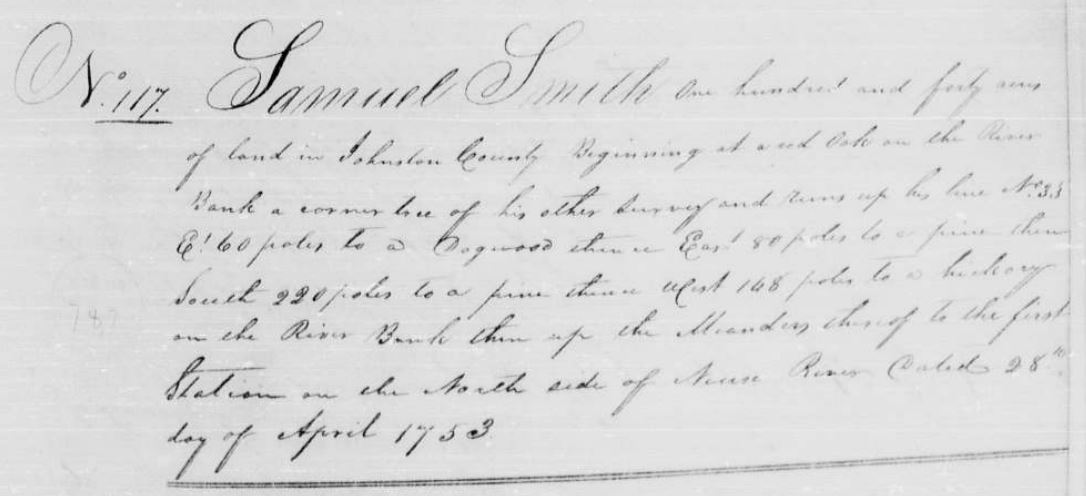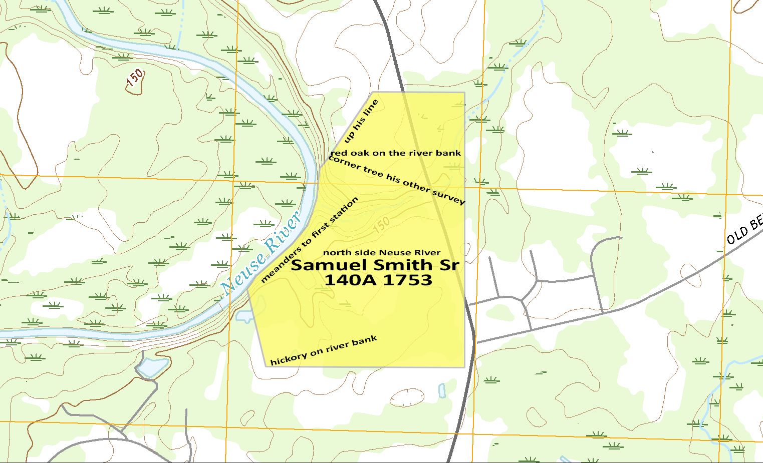 “…. beginning at a red oak on the River Bank a corner tree of his other survey …. to a hickory on the River Bank then up the meanders thereof to the first station on the north side of Neuse River ….”