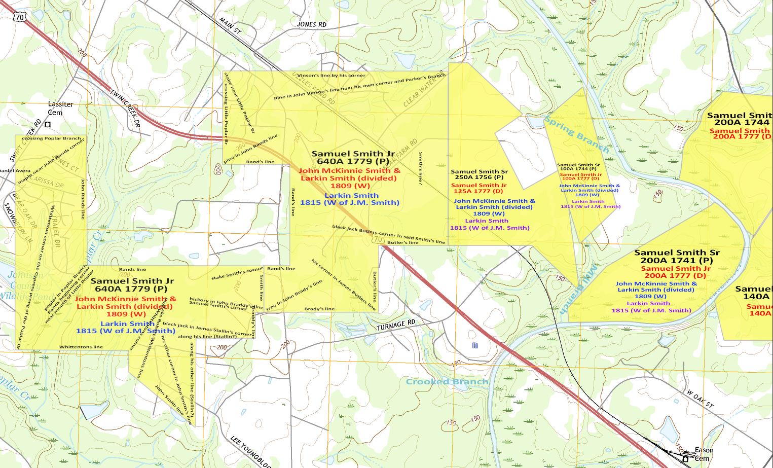 So up to this point we see that Samuel Smith Jr willed his land on the south side of Neuse river to his sons John and Larkin to be equally divided in 1809.