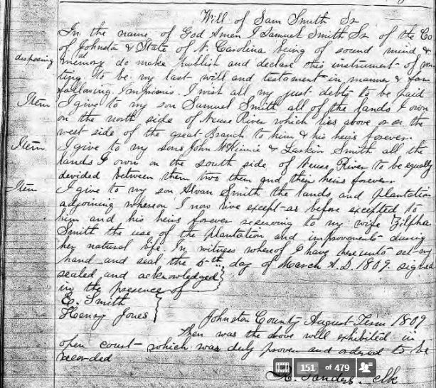” …. I give to my son Samuel Smith all of the lands I own on the north side of Neuse River which lies above or on the west side of the great Branch to him & his heirs forever …. ”
