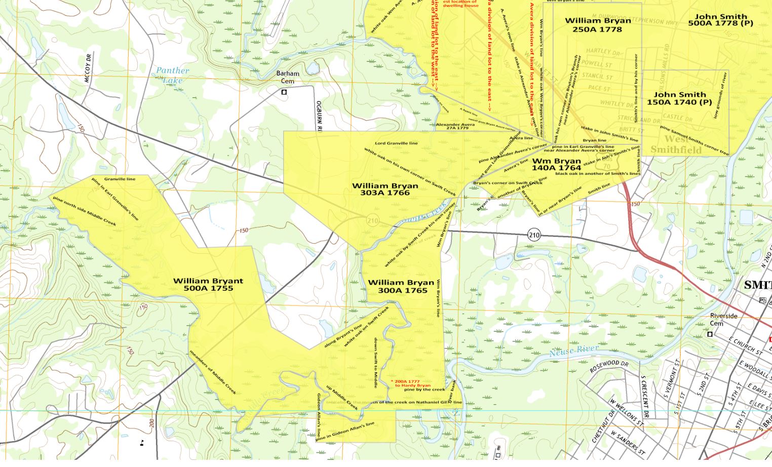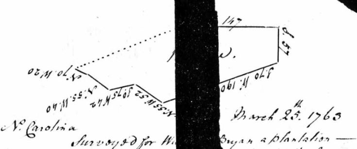 The warrant for the 500A parcel is written for William Bryan on the south side of Neuse River joining Earl Granville’s & his own lines on Swift Creek. On the survey however, Bryan is spelled Bryant and that is how it is recorded in the patent books.