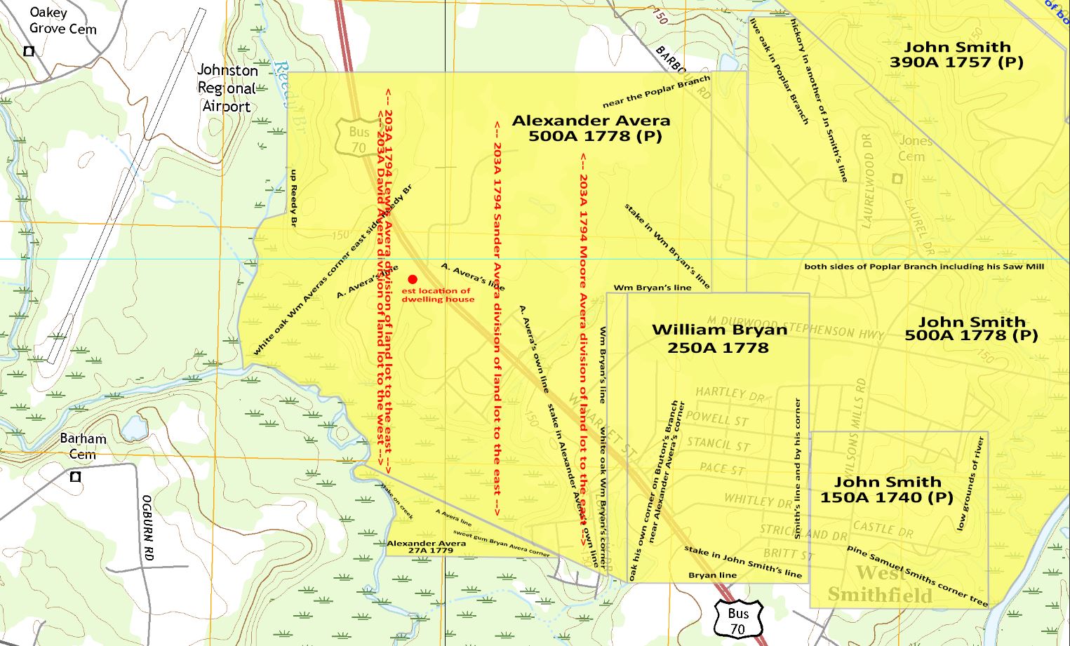 Alexander Avera Alexander Avera patented 500A in 1778. (SLPB VOL:40/PG:114) When Alexander died, his lands were divided equally among his heirs as shown below. Johnston County Superior Court Estate Records 1771 – 1962 Share this: Click to share on X (Opens in new window) X Click to share on Facebook (Opens in new window) Facebook Like Loading... Related Leave a comment Cancel reply Δ