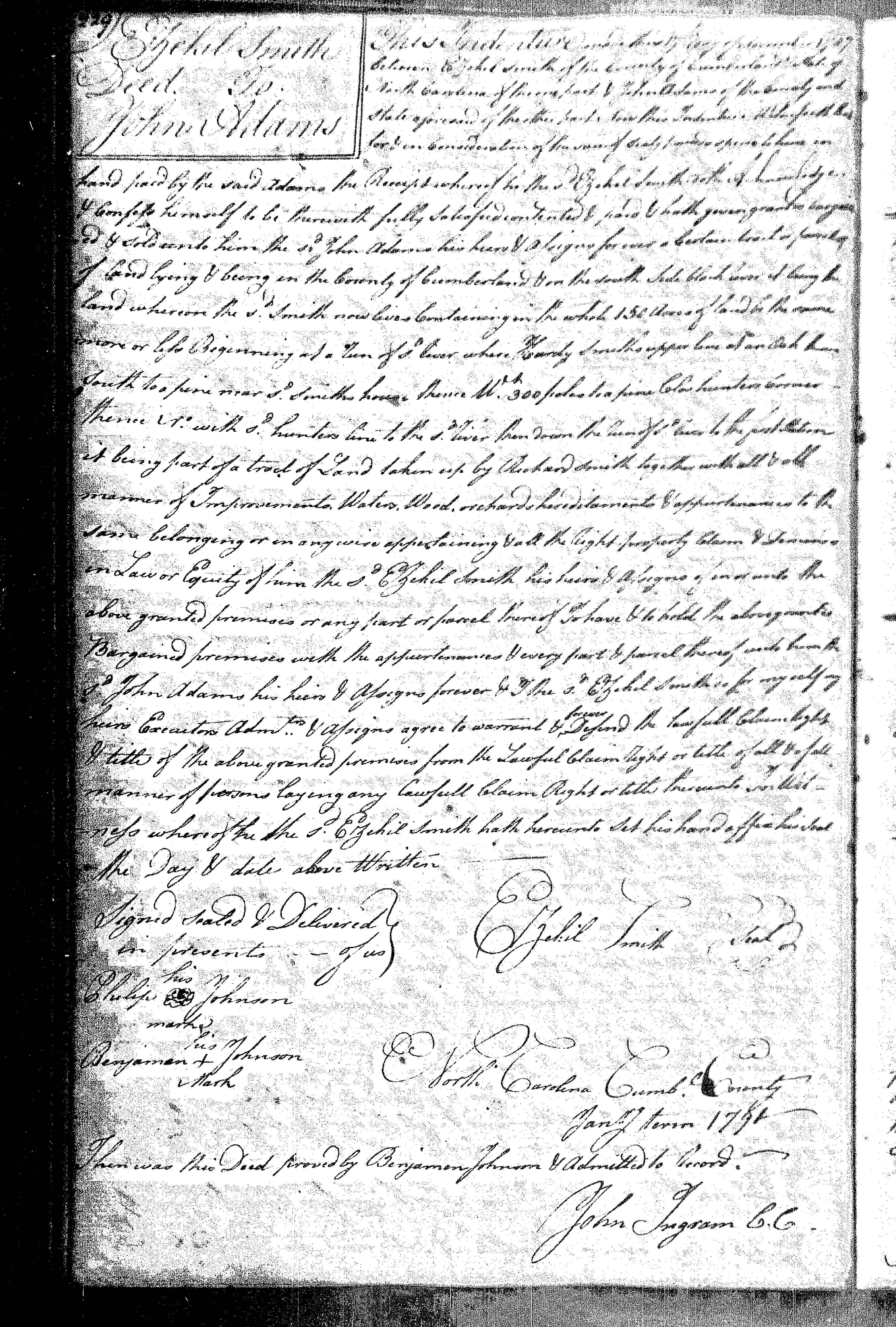 “…. land lying & being in the County of Cumberland, on the south side Black River *** *** being his land whereon the said Smith now lives containing in the whole 150 acres of land be the same more or less. Beginning at a run of said River where Hardy Smiths upper line at an oak thence south to a pine near said Smiths house thence West 300 poles to a pine Col Hunters corner thence North with said Hunters line to the said River thence down the run of said River to the first station. It being part of a tract of land taken up by Richard Smith ….”. View the full deed here.