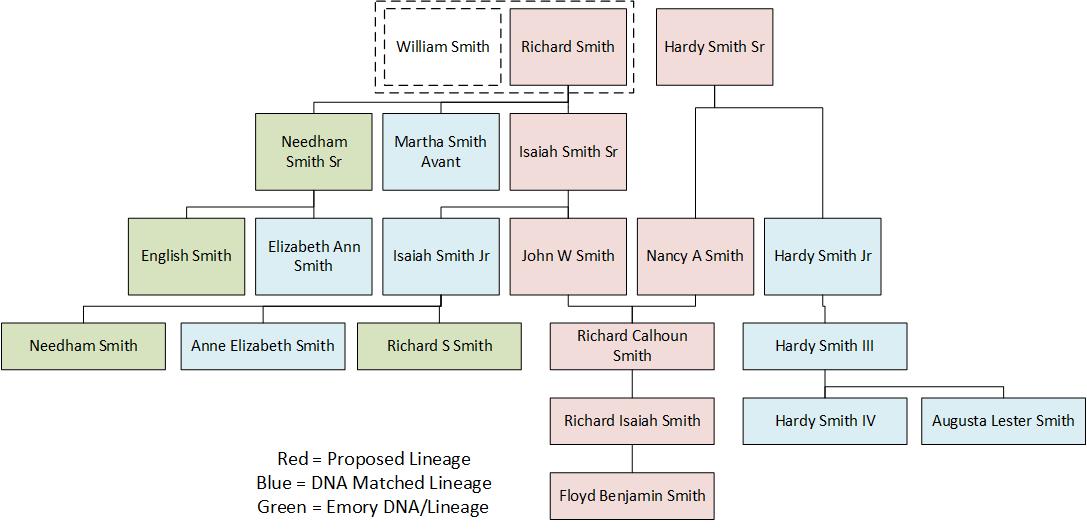 10. DNA Match (fawn 6) Emory matches with username carlj3068 {17cm/1seg}. This users traced lineage via documented sources: Kit Carson Kyle > Sophronia Miller > Patience E Smith > English Smith > Needham Smith Sr > William Smith (Richard Smith). This DNA match is important because it shows that Emory and I still are showing a common DNA match past the Smith separation with John W Smith and Nancy A Smith.