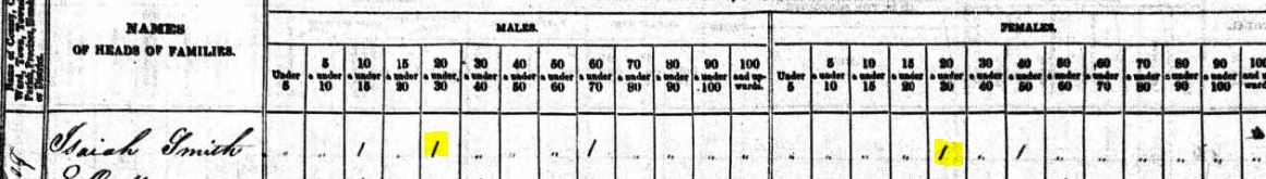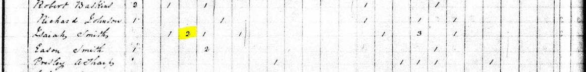 Listed in the 1830 U.S. Census for Houston County, Georgia is Isaiah Smith Sr. In the fourth column it indicates that there are 2 males of 15 years old and under 20. John W Smith was born c1813, he would be about 17 years old in 1830 and accurately represented here in the 1830 U.S. Census. The other male in this column his John’s brother Richard.