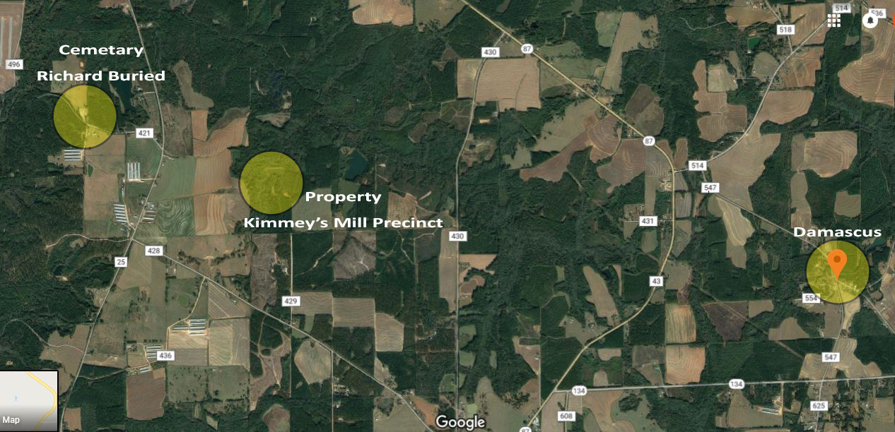 Here is a Google Map snippet to show you the general relationship of where the property was in Kimmey’s Mill, where Richard Calhoun Smith is buried, and the town of Damascus, Coffee County, Alabama. (Kimmey’s Mill can be crossed referenced from the census enumeration maps found here)
