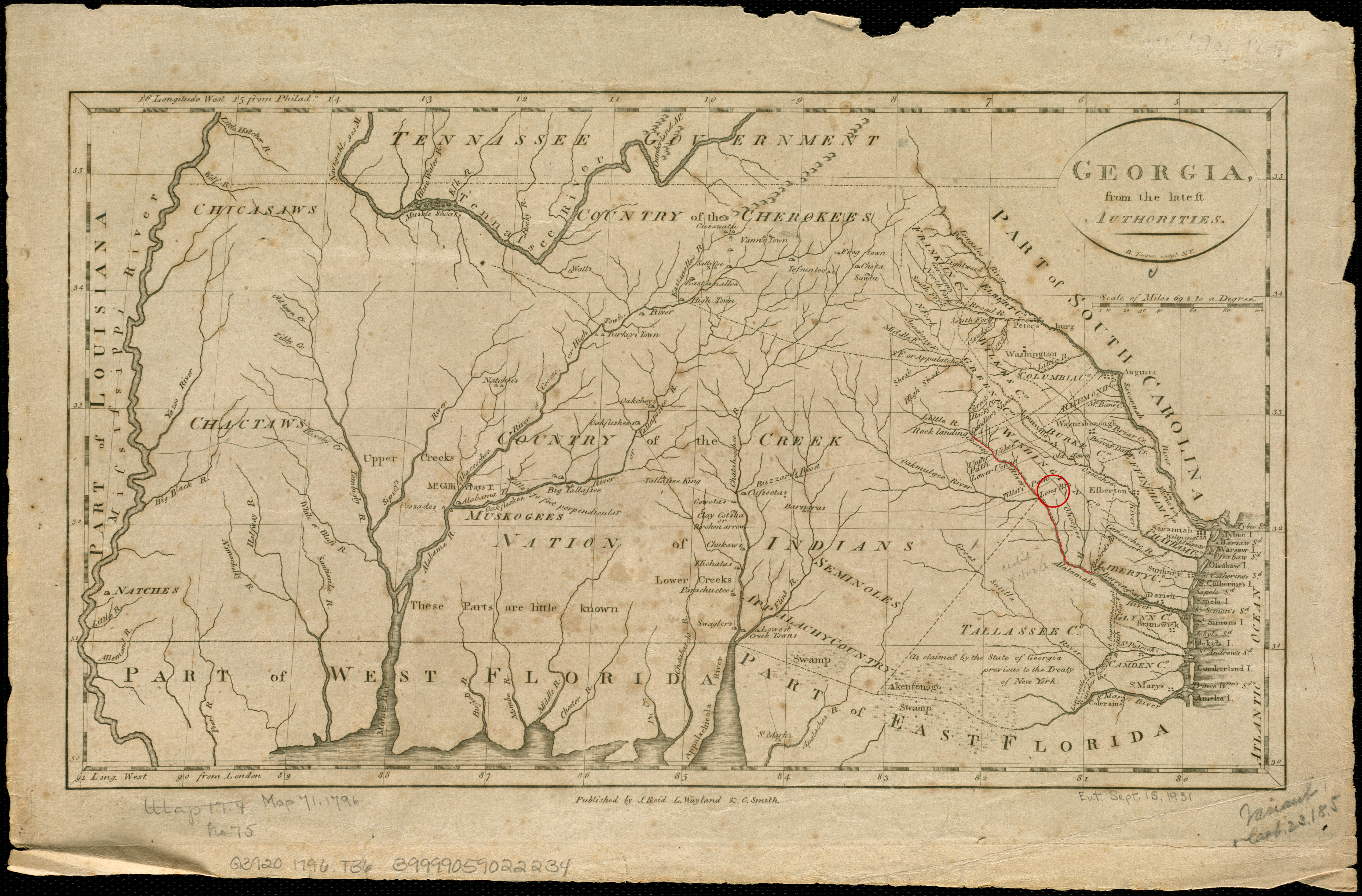 Here is a map created by Benjamin Tanner (1775-1848) dated 1796. I’ve marked in red the part of the Oconee River that formed the south western border of Washington County and circled Long Bluff. This gives us perspective of area during that time and the general area where John W Smith was likely born. Everything to the west was the Indian Frontier at the beginning of the 19th century.
