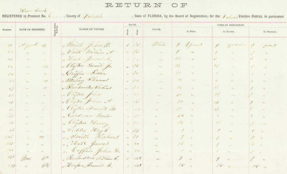 Below is a snippet of the 1867-68 Voter Registration Roll for the 6th Precinct (Haw Creek), Volusia County. Of the 18 people registered to vote, listed is John W Smith his sons William A Smith and Richard Smith along with James F Hull (John’s son-in-law).