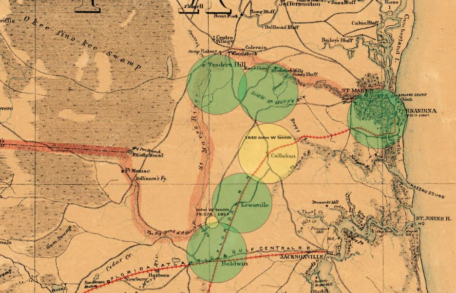 It seems that John may have served/volunteered for at least six months, during the 2nd Seminole War (1835/42), in the Florida Militia. This could provide some of the underlying cause and effect in why John moved from Georgia to Florida. Between 1848 – 1850, John and family left Georgia and moved to Nassau County, Florida as recorded in the 1850 U.S. Census. Through deduction reasoning, examining the location of his neighbors from the 1850 to the 1860 census, John appears to have lived in the vicinity of Callahan, Nassau, Florida.