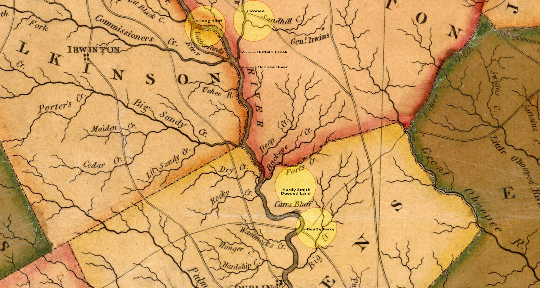 Here is map snippet that I’ve used before and have further annotated the believed general proximity where John W Smith was born and raised. This is loosely based on the the land warrants of a William Smith around Oconee and where a Richard Smith was stationed at Long Bluff. More of this location can be examined in an article about Needham Smith Sr.