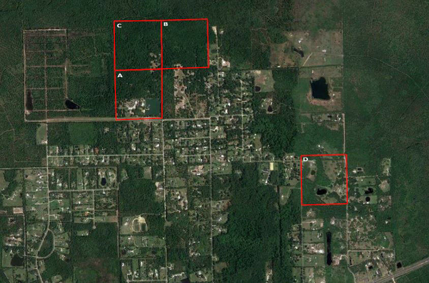 On 8 February 1878 John W Smith and Nancy A Smith of Volusia County sold to Needham J B Smith of Volusia for the sum of $50, a parcel of land lying and being in Volusia County known and described as the North East quarter of the South East quarter of Section 24 in Township 14 South of Range 30 East. Witnessed by Wm C Bennett and J. Wilkinson. Signed by John W Smith (X – his mark) and Nancy A Smith (X – her mark) {Volusia DB E:69} {represented by A on the image below}