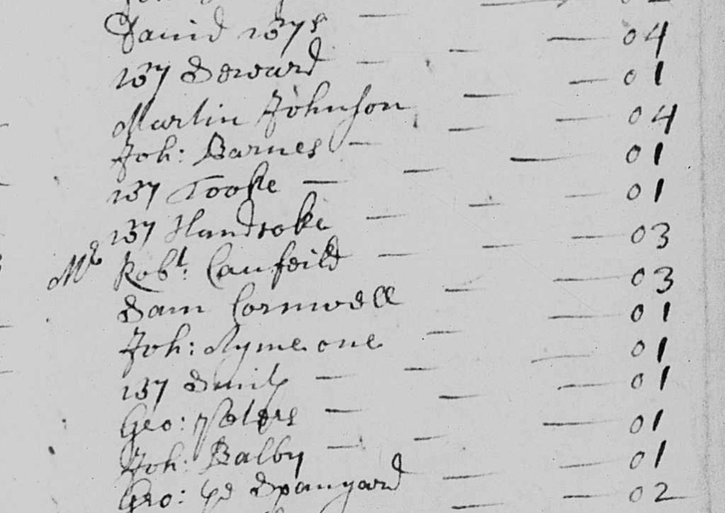 Snippet of the 1669 Surry Tithable List. Source: Surry County Deed Book 1, 1652-1672, pg. 347. See full page here. Names listed above are David Williams, William Seward, Martin Johnson, John Barnes, William Tooke, William Hancock, Robert Caufield, Samuel Cornwell, John Aime, William Smith, George Peters, John Balby, George ye Spainard.