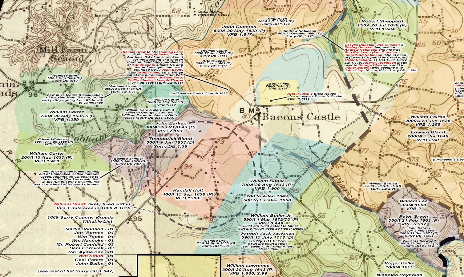 William Smith’s residence can be traced to Lawne’s Creek Parish, and situated in the region approximately south-southwest of Bacon’s Castle within Surry County, Virginia. This determination is based on an analysis of land grants and deeds, of others from that era, which have been cross-referenced with other pertinent Surry County records.