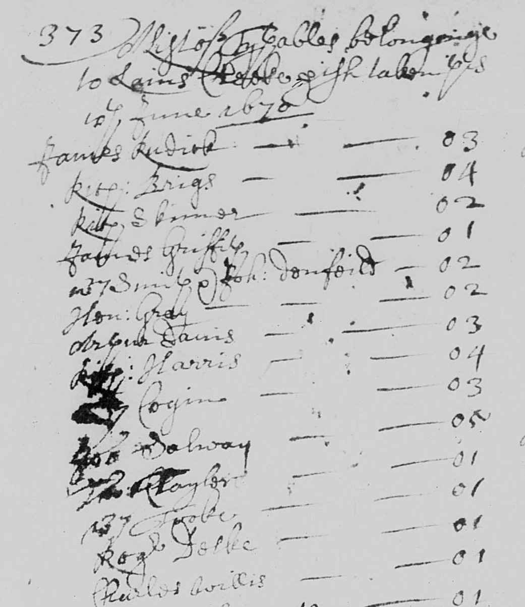 Snippet of the 1670 Surry Tithable List. Source: Surry County Deed Book 1, 1652-1672, pg. 373. See full page here. Names listed above are James Riddick, Richard Briggs, Richard Skinner, James Griffin, William Smith, John Denfeild [Dunford], Henry Gray, Arthur Davis, Richard Harris, William Coggin, John Salway, Thomas Taylor, William Tooke, Roger Delke, Charles Willis.