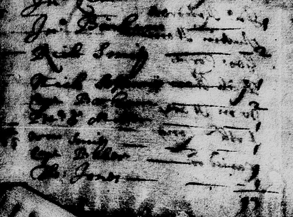 Snippet of the 1675 Surry Tithable List. Source: Surry County Deed Book 2, 1671-1684, pg. 94. See full page here. Names listed above are John Dunford, Robert Temple, John Bishop, James Hargrove, William Gray, Thomas Waller, Henry Gray, John Gray, William Smith, William White, Arthur Long, Hance Cooper.
