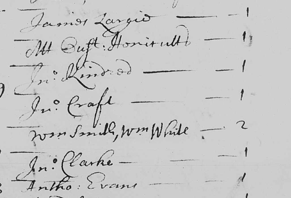 Snippet of the 1674 Surry Tithable List. Source: Surry County Deed Book 2, pg. 64. See full page here. Names listed above are James Largie, Augustine Hunnicutt, John Kindred, John Craft, William Smith, William White, John Clarke, Anthony Evans.