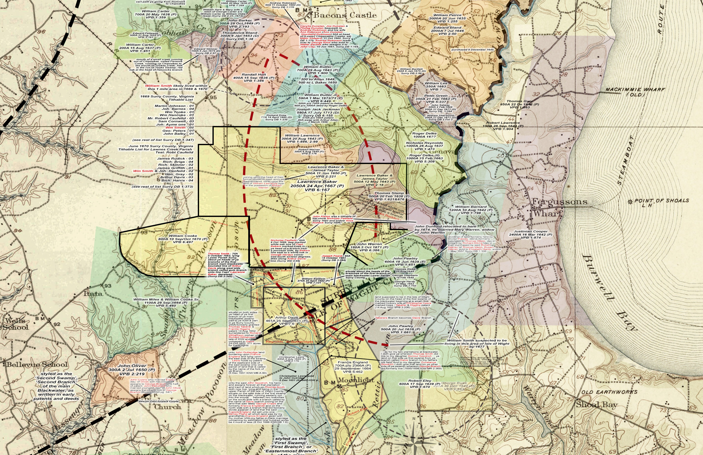 Mathew Fones may have lived in that area of Isle Of Wight where the county line with Surry stops following the creek and becomes a diagonal line. This broad area is also where George Hardy and William Bennett, amongst others lived and had relationship connections back to Mathew Fones. Mary Hardy was wife of George Hardy who lived next to the Surry County line and Elizabeth Baker was the wife of Lawrence Baker of Surry.