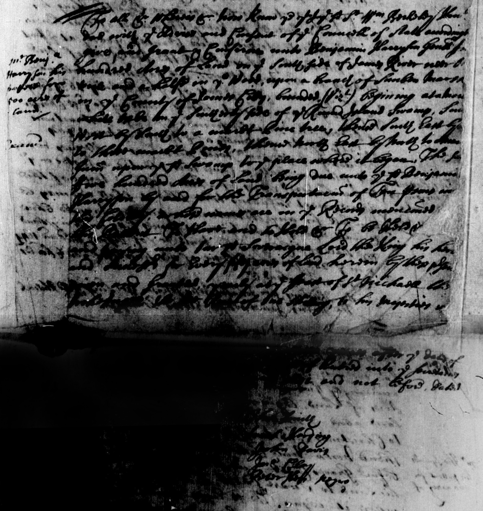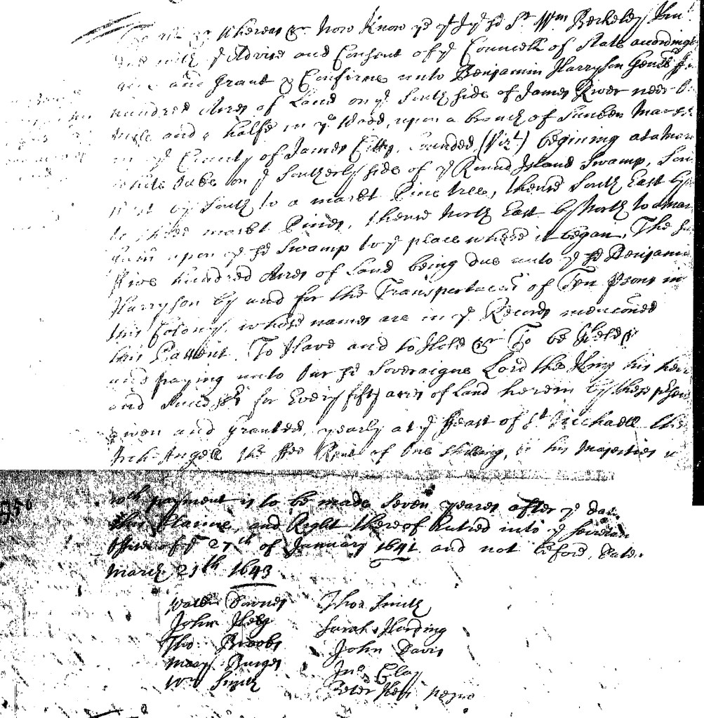 To all &c Whereas &c Now know ye that I ye said Sir William Berkeley Knight doe with ye advice and consent of ye Counsell of State accordingly give and grant & confirme unto Benjamin Harryson [sic], Gentlemen five hundred acres of land on ye South Side of James River neare one mile and a halfe in ye wood, upon a branch of Sunken Marsh in ye County of James Citty, bounded (viz) beginning at a marked white oake on ye southerly side of ye Round Island Swamp, soutwest by south to a marked pine tree, thence south east by east to three marked pines, thence north east by north to a marked gum upon ye said swamp to ye place where it began. The said five hundred acres of land being due unto ye said Benjamin Harryson by and for the transportation of ten persons in this Colony whose names are in ye records mentioned under this Pattent. To have and to hold &c To be held &c yeilding and paying unto our said Sovereign Lord thee King his heirs and successors, for every fifty acres of land herein by these presents given and granted yearly at ye feast of St Nicholas the Archangell, the ffee rent of one shilling, to his majesties instructions with payment is to be made seven years after ye date this {illegible} and right thereof {illegible} into ye {illegible} 7th of January 1641 and not before date March 21th 1643.