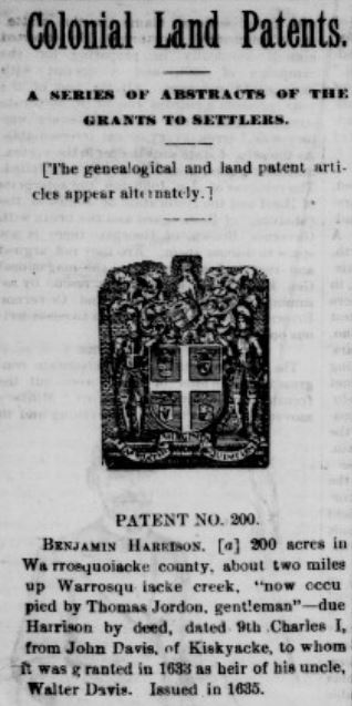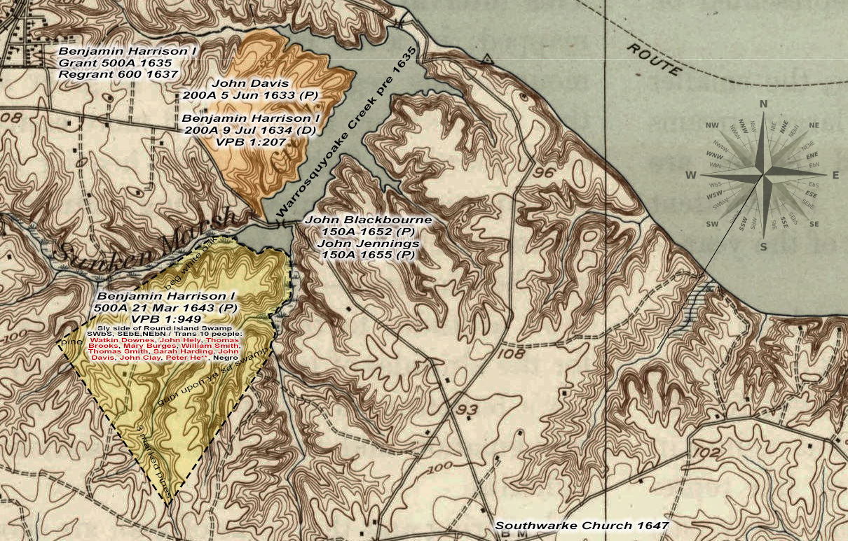 John Davis is listed on the Harrison grant as an individual for whom Benjamin Harrison claimed for his Headright grant. It may be inferred that this John Davis is the same person who was awarded land as part of a dividend granted unto him by order of Court, being recognized as the heir to his uncle Walter Davis (VPB 1:207).
