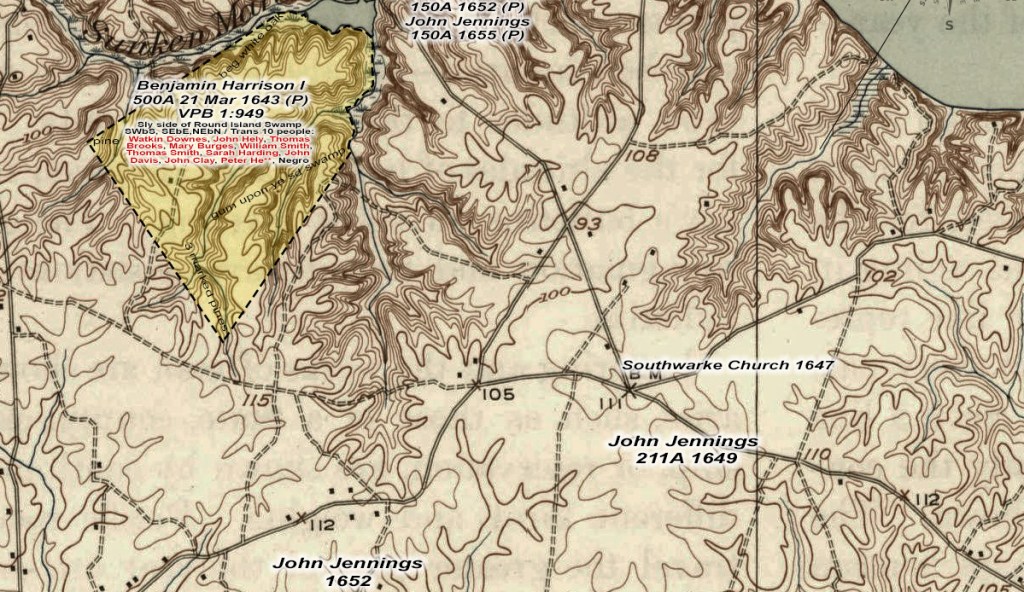 In 1643 Benjamin Harrison (I) was granted 500 acres of land in James City County, which would later be known as Surry County, Virginia.