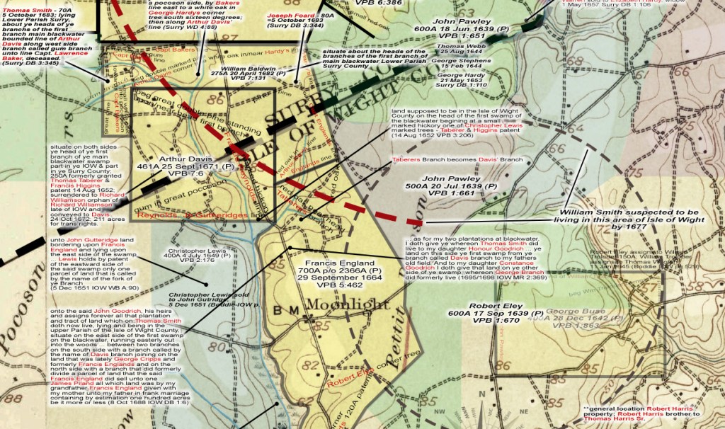 Robert Harris, of Isle Of Wight, is believed to have passed away prior to 1659, and it is conjectured (based where his sons were living after his death) that he owned property located east of the first swamp of the main Blackwater, as depicted on the map below. Part of Lawnes Creek is situated to the north of the proposed property.