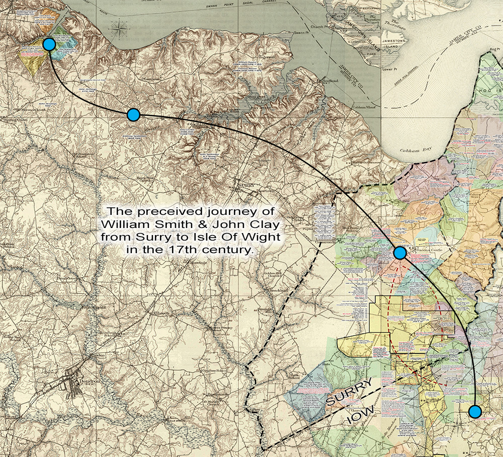 On February 28, 1663, Anthony Spiltimber of Surry and his wife Mary, daughter of Robert Harris formerly of Isle of Wight, conveyed 250 acres on Lawne’s Creek to John Clay of Surry. This John Clay is presumed to be the same individual listed on the Harrison grant alongside William Smith. Subsequently, William Smith of Lawnes Creek Parish relocated to this area of Isle Of Wight by 1677, as depicted on the map above.