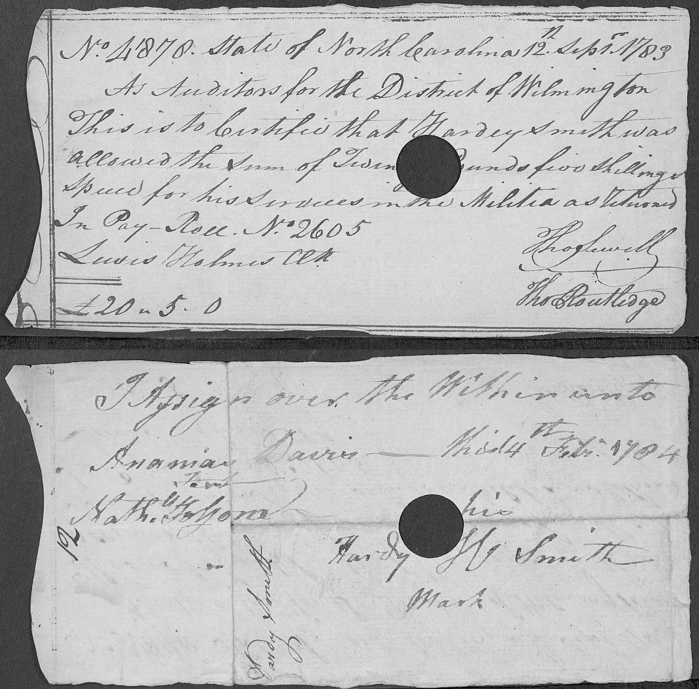 On 14 February 1784, Hardy Smith transfered this voucher over to Ananias Davis.