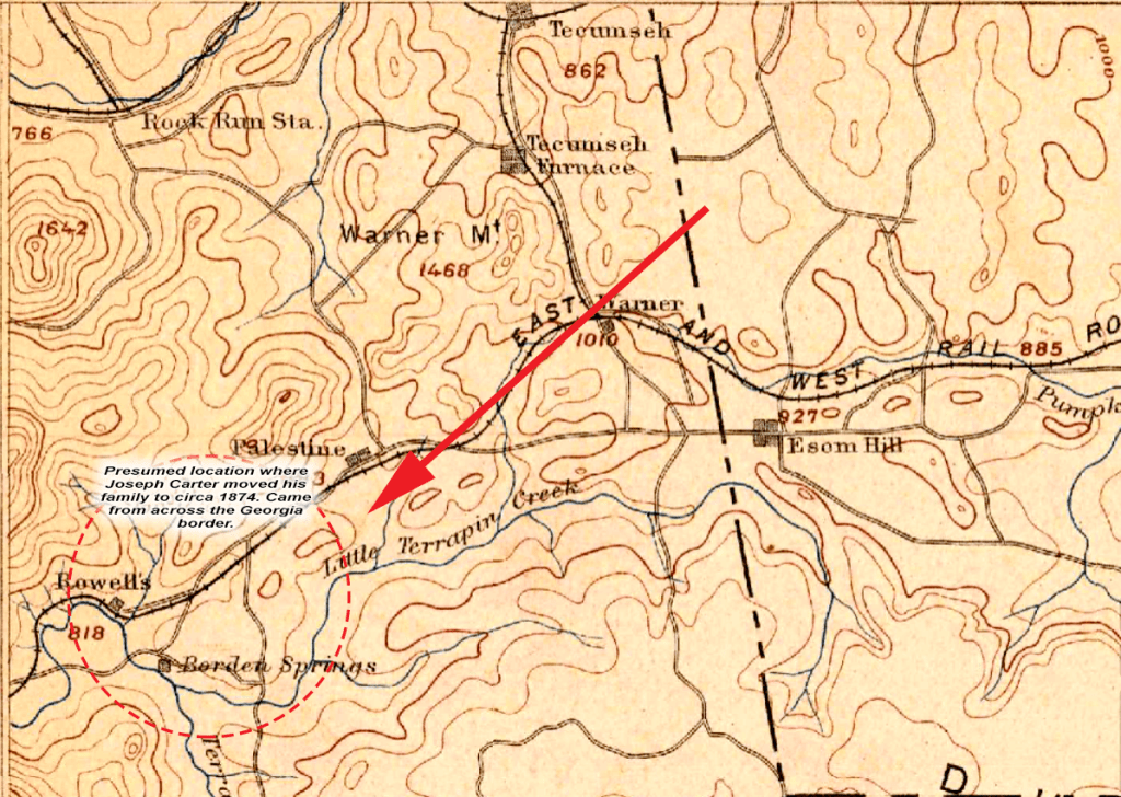 By the fall 1874, Joseph Carter moved his family to Borden Springs, Cleburne County, Alabama, situated approximately ten miles west across the Georgia and Alabama border. Borden Springs, nestled high in the foothills of the Blue Ridge Mountains, was a small community named after the notable Borden family who settled in the area during the early to mid-19th century.
