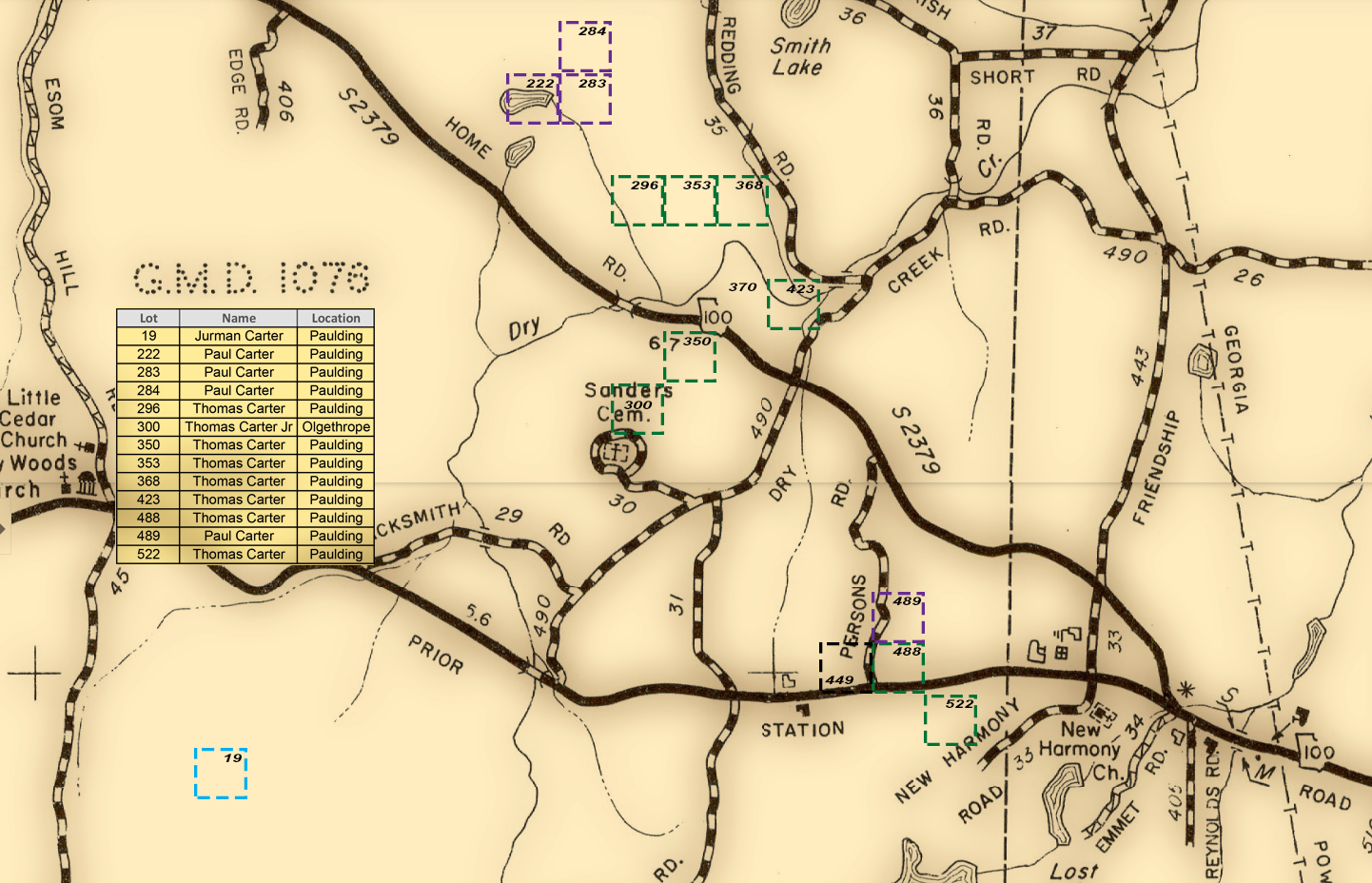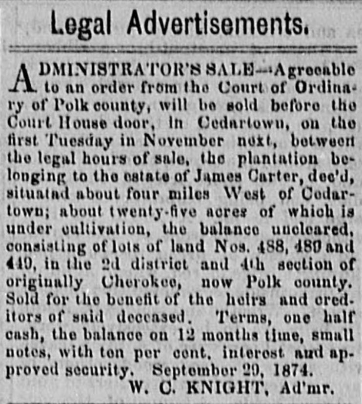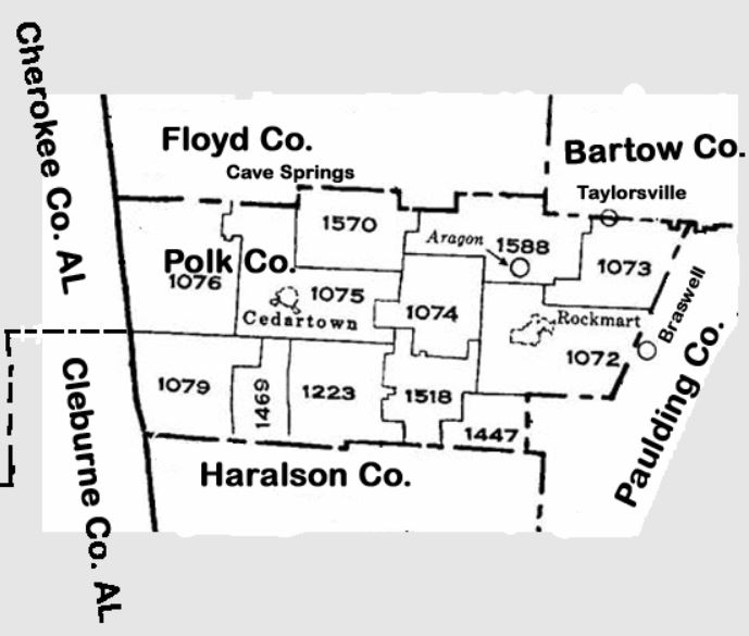 On 20 December 1851, the area where the Carters lived became part of the newly formed Polk County. The land along Dry Creek was included in Militia District 1076 of Polk County.