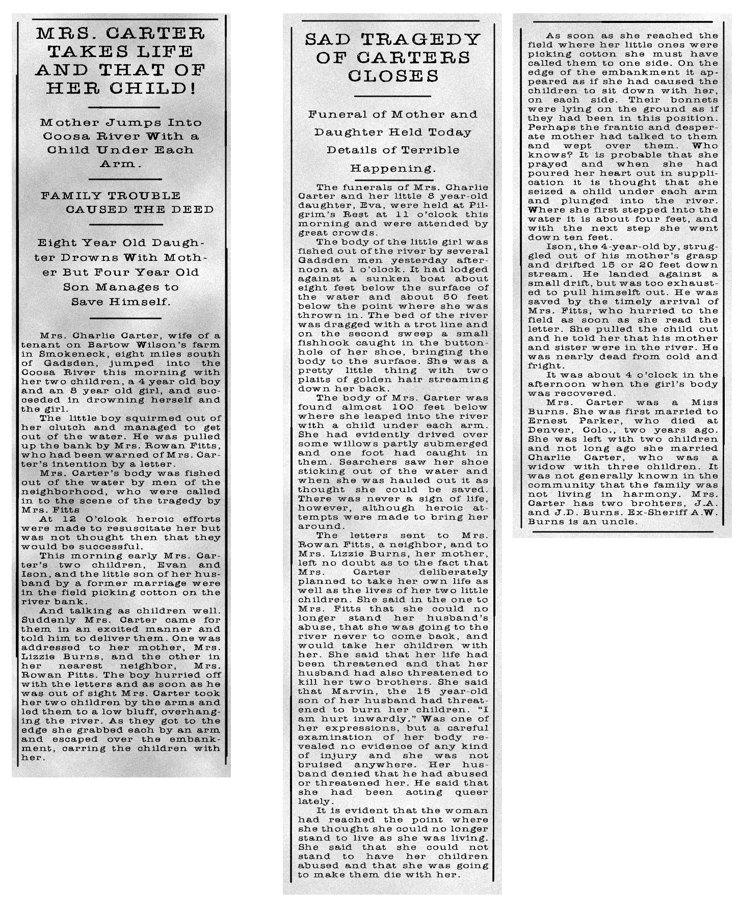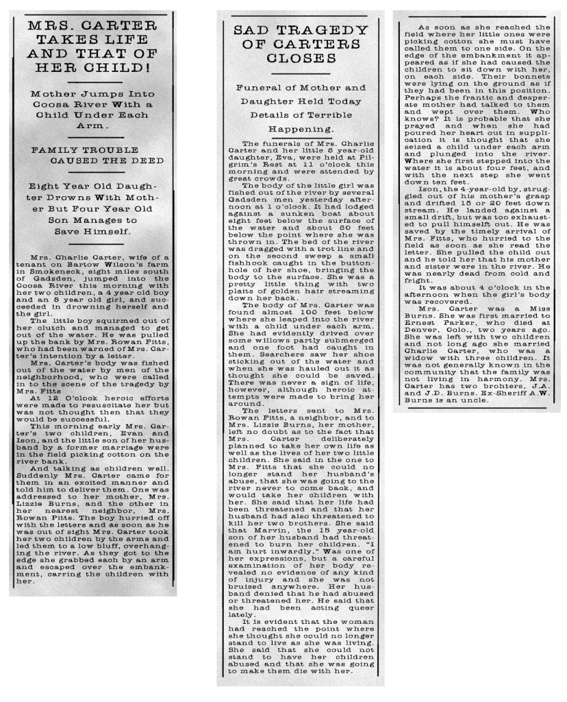 On an November day in 1916, Henrietta led her two children, Mary Eva, now 7, and her 5-year-old son, to the banks of the Coosa River. Despondent and reportedly struggling with family difficulties, Henrietta jumped into the river with a child under each arm. Her young son managed to wriggle free and escape, but Mary Eva tragically drowned alongside her mother. Their bodies were later recovered from the river, and attempts to resuscitate them were unsuccessful.