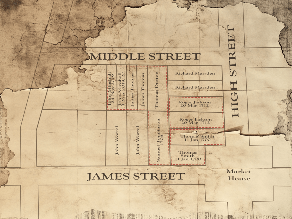 The six lots owned by John Minshall were assembled from various purchases, creating a unique patchwork of Chester Borough’s early history. Two of these lots were originally part of the land purchased from Jonas Sandelands. Interestingly, the Borough of Chester itself was established on a 20-acre patent granted in 1686 to Jonas’s father, James Sandelands. Minshall added to his holdings by acquiring two more lots from James Thomas, one from Thomas Dutton, and another from Samuel Tomlinson.