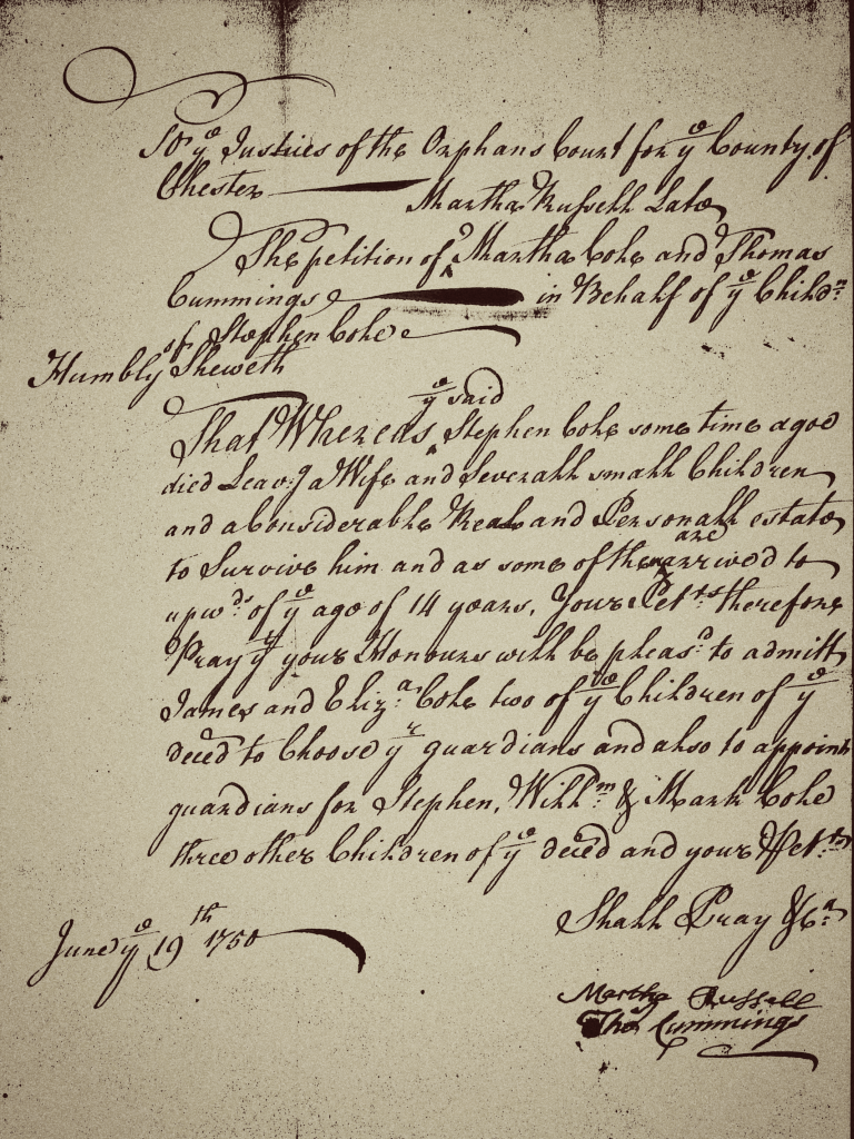 In 1750, Martha Cole filed a petition in the Chester County Orphans’ Court to address the guardianship of her children following the death of her husband, Stephen Cole, six years earlier. By this time, two of her children, James and Elizabeth, had reached the age of 14, the age at which they were legally able to choose their own guardians. The court also appointed guardians for the younger children, Stephen Jr., William, and Mark, who were still under 14 and could not yet make that decision themselves.