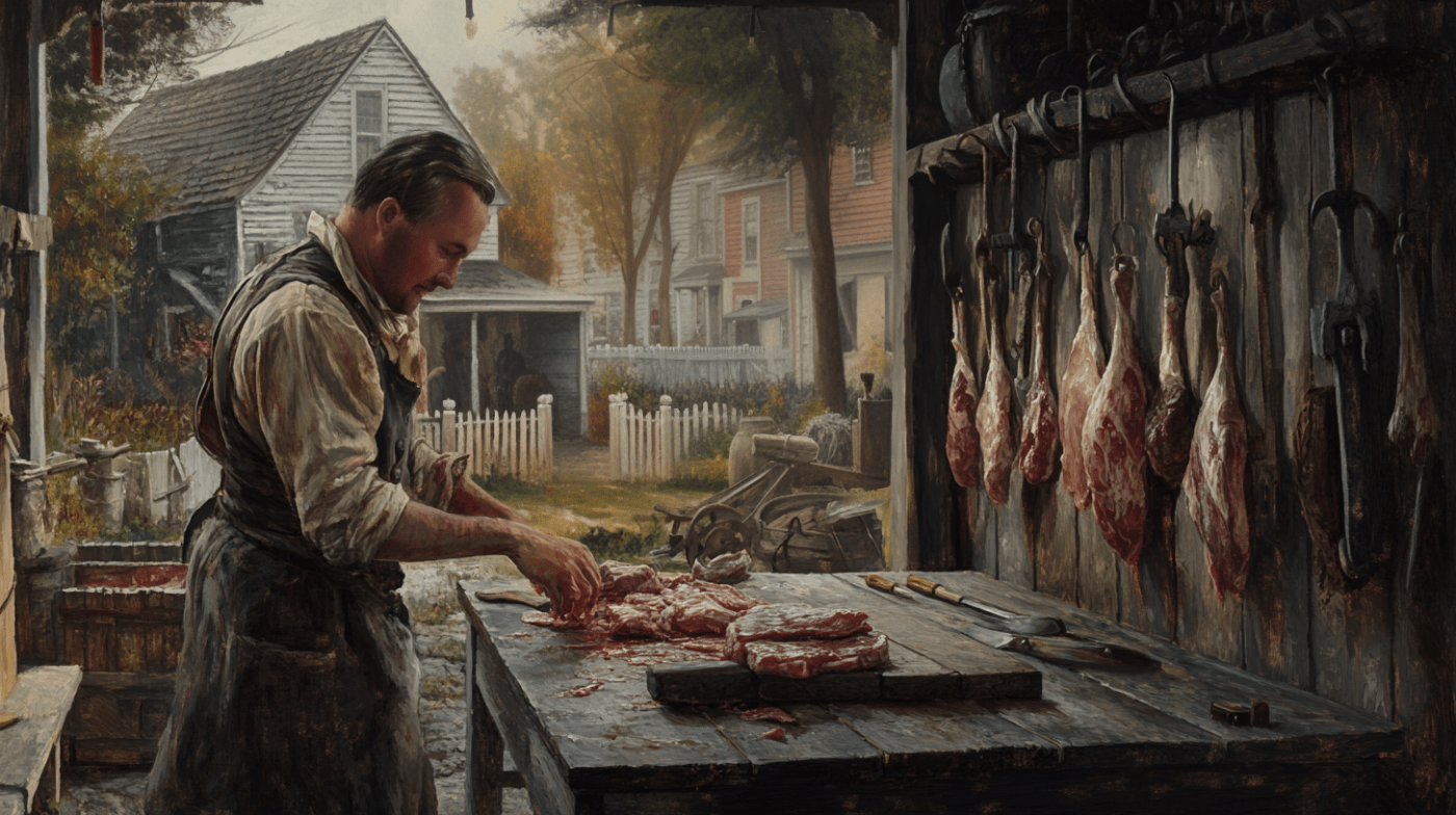 The properties Stephen acquired likely doubled as his butcher’s shop, a place of hard work and bustling activity. Butcher shops in colonial towns were often simple but efficient spaces, designed for processing meat and serving customers. The shop would have included a sturdy workbench, hooks for hanging meat, and possibly a cooling area for storing products temporarily. Though refrigeration didn’t exist, Stephen might have used techniques like salting or smoking to preserve meat. It’s easy to imagine the sounds and smells of the shop—tools clanging, livestock being delivered, and the earthy aroma of fresh cuts of meat—as Stephen worked to serve the residents of Chester.