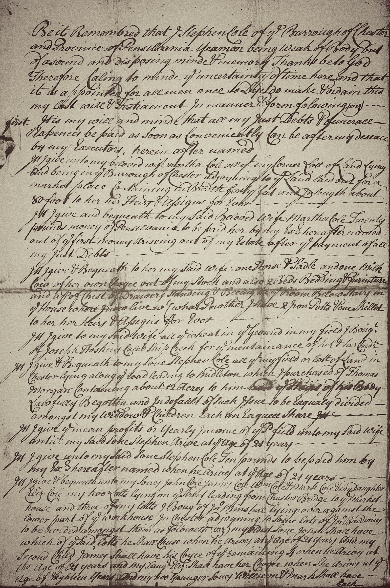 Item I give & bequeath unto my sons John Cole, James Cole, William Cole & Mark Cole & my daughter Elizabeth Cole my two lotts lying on ye street leading from Chester Bridge to ye Market house and three of my lotts I bought of John Minshall lying over against the lower part of ye work house in Chester adjoining to some lots of John Baldwin to be divided amongst tem as followeth (viz) my oldest son John shall have which of ye said five lotts he shall choose when he arrives at ye age of 21 years and my second child James shall have his choice of ye reamining 4 when he arrives at the age of 21 years and my daughter Elizabeth shall have her choice when she arrives at ye age of eighteen years and my two younger sons William & Mark shall have each their choice of ye remaining lots as they arrive at ye age of 21 years, respectively but & if any of my said children should die before they arrive at ye respective ages mentioned and leave no issue then it is my will & mind of ye respective share of ye child said dying shall be equally divided amonst my widow & surviving children.