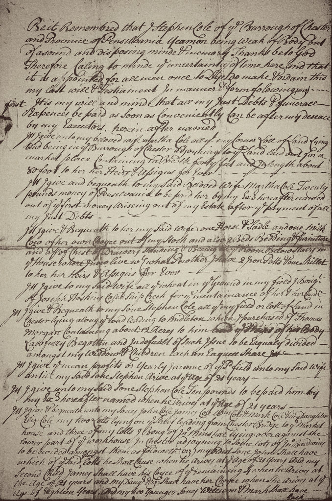 Be it remembered that I Stephen Cole of ye Burrough of Chester and Province of Pennsylvania, Yeoman being weak of body but of a sound and disposing mind & memory. Thanks be to God therefore calling to mind ye uncertainity of time here and that it is appointed for all men once to dye do make & ordain this my last will & testament. In manner & form following, viz