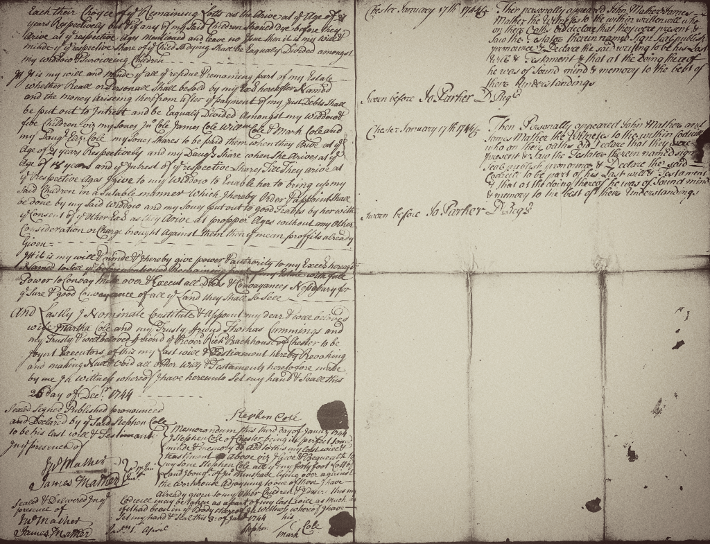 On 26 December 1744, Stephen Cole made his last will & testament: