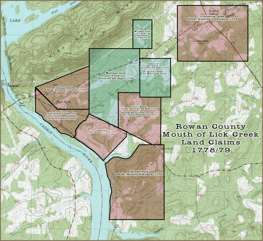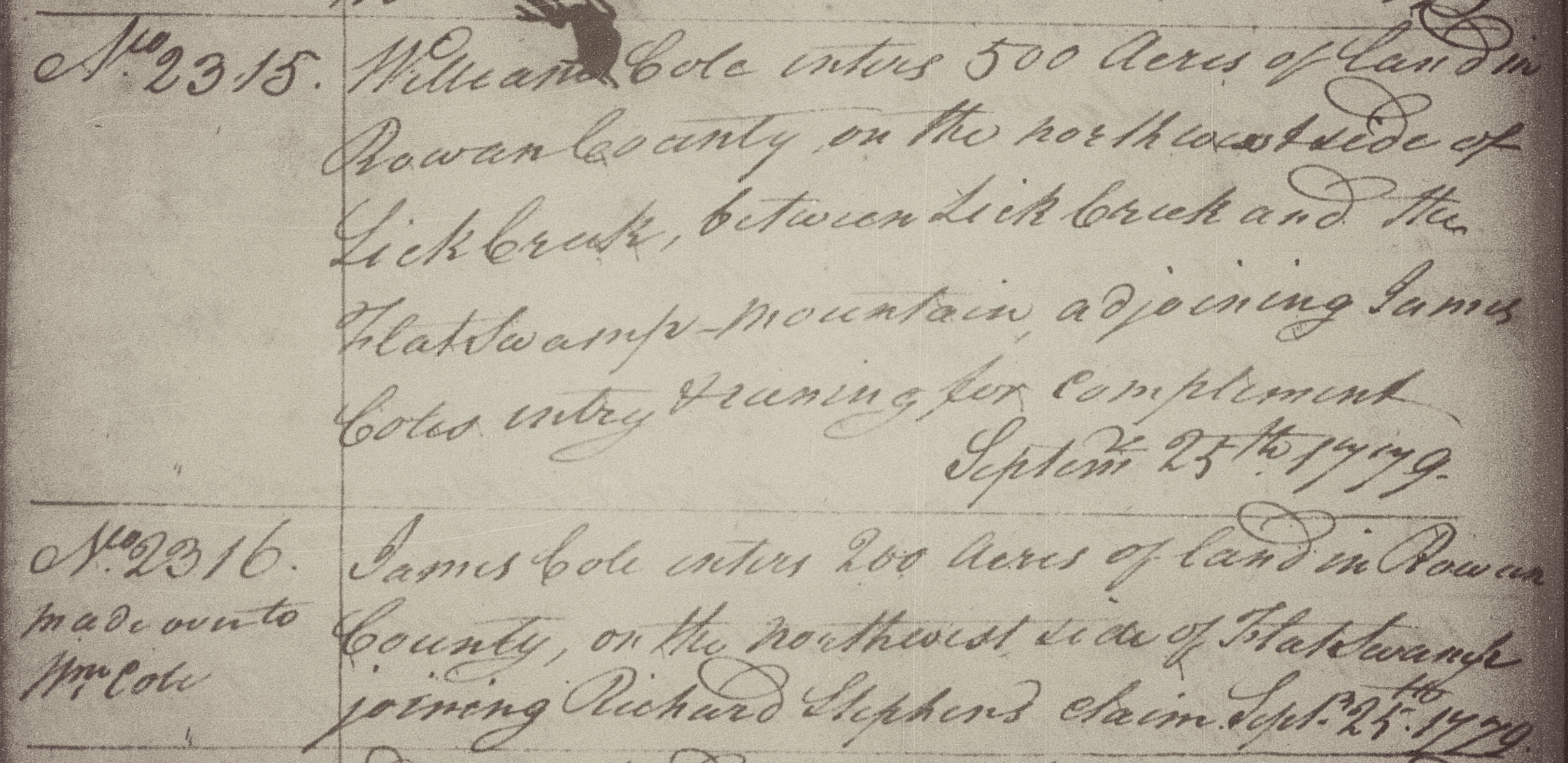 In January of the following year, WIlliam made his way to Salisbury to take the next step in securing his claim. There, he met with the Entry Taker and provided a detailed description of the desired tract, including its boundaries and notable features. His claim was recorded on 31 January, 1779, and read: “William Cole enters 100 acres of land in Rowan County on the waters of Lick Creek on the southeast side of Flatt Swamp Mountain, known by the name of the Mulberry Bottoms.”