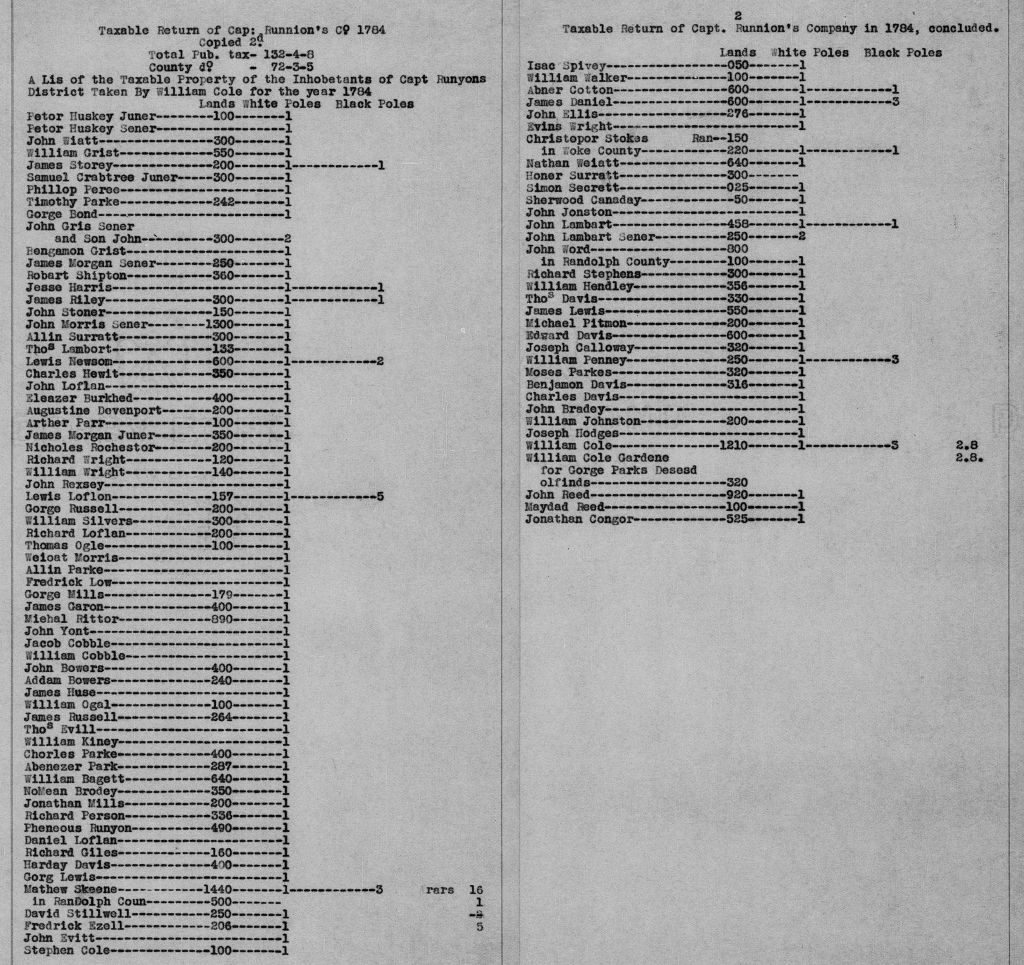 Captain Phineas Runyon’s company likely served as both a militia district doubling as a civic administrative area, setting the geographical boundaries for the taxation process in Rowan County. This district stretched from the Yadkin River eastward, covering the areas along Lick Creek and Cabbin Creek. Captain Runyon owned a tract of land at the head of Cabbin Creek, located on the opposite side of the district from where William Cole lived. Phineas Runyon also owned property near the head of Lick Creek, adjoining the land of Absalom Cameron, who would later become part of the Cole family when he married William Cole’s daughter, Mary Cole, in 1786.