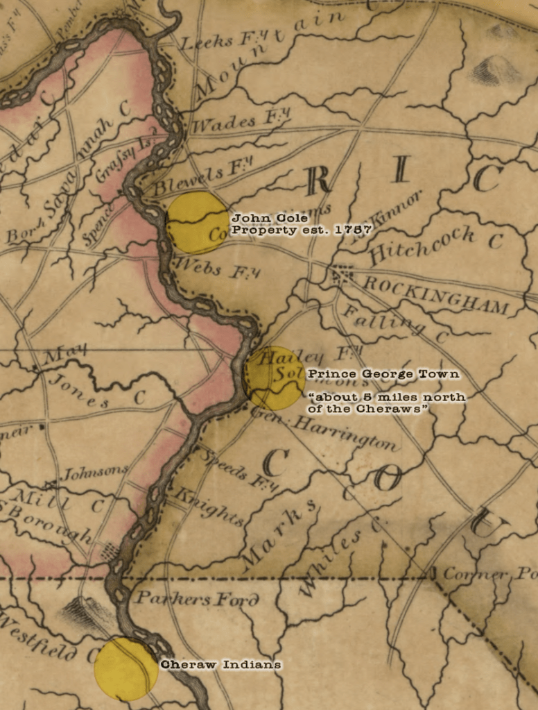 John Cole, a shoemaker, was among the first to establish a presence in Anson County, purchasing 400 acres on Cartledge Creek on December 31, 1757. In 1760, he sold 100 acres of this tract to his brother Stephen, a hatter, demonstrating an early example of familial collaboration. This deed was witnessed by their brother William Cole, a cordwainer, and a local associate, William Coleman. By 1761, both John and Stephen had purchased half-acre lots in Prince George Town, adjacent to one another. Prince George Town (established in 1759) was a few miles away from his Cartledge Creek property. John and Stephen were listed as merchants, with John styled as a “Merchant of Anson County” and Stephen as a “Merchant of Bladen County,” suggesting that the brothers were leveraging their trades to engage in a localized trading network that likely extended north to their base in Salisbury, Rowan County.