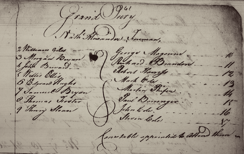 The 22 March 1762 Salisbury Supreme Court record that conviened a Grand Jury. The jury was made of Nathaniel Alexander – Foreman, William Giles, Morgan Bryan, John Brevard [sic], Willis Ellis, Edward Hughes, Samuel Bryan, Thomas Foster, Henry Sloan, George Magown [sic], Richard Brandon, Robert Harris, Mark Cole, Martin Phiser [sic], Paul Bassinger, John Cole and Steven Cole (Stephen Cole).